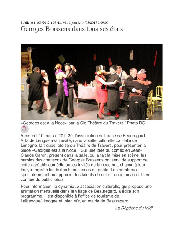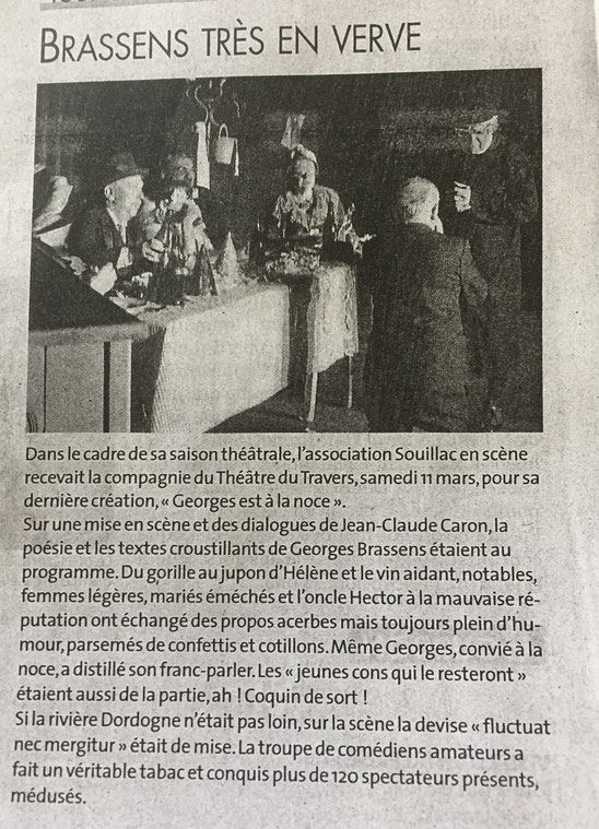troupe du Théâtre du Travers. L'idée initiale d'une lecture de textes a évolué très vite vers un projet théâtral : on allait s'exprimer en «Brassens» ! Le thème de la noce fut évident dans